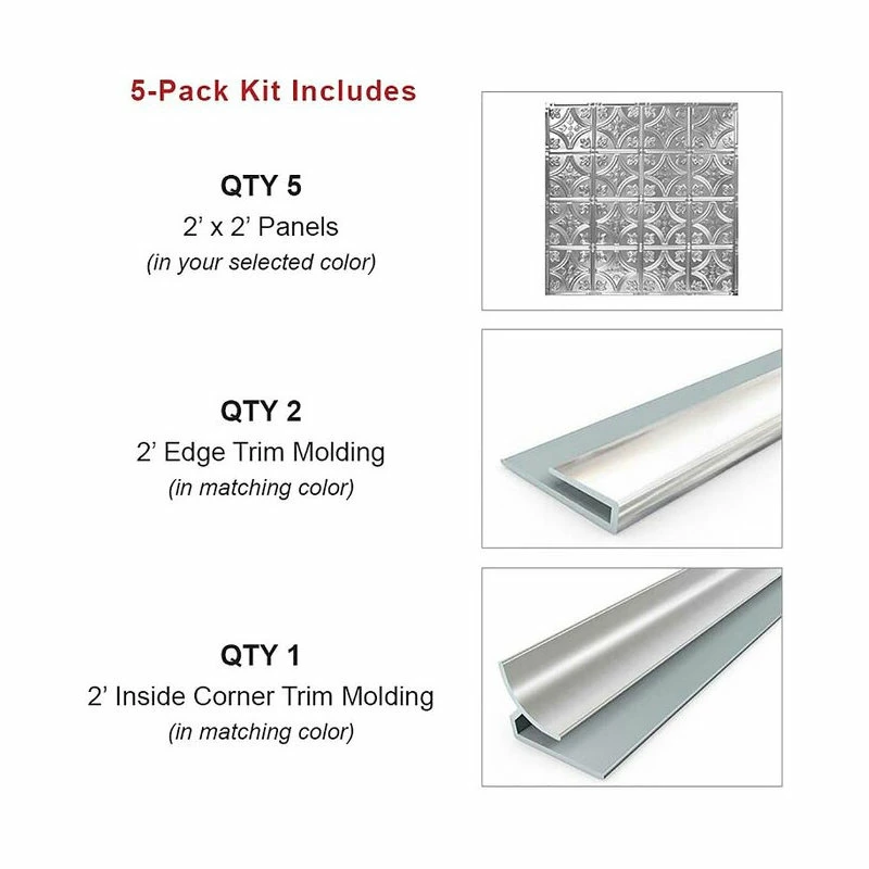 Backsplash kit with panel 5-pack and matching trim molding (4′ edge trim and 2′ inside trim). pattern #27 features a charming floral design with a Parisian Art Deco influence. This (2’x2′) authentic tin tile has a 6 inch minimally-embossed repeat, which makes it an excellent choice for a beautiful yet subtle backsplash renovation. Easy installation for a DIY project.