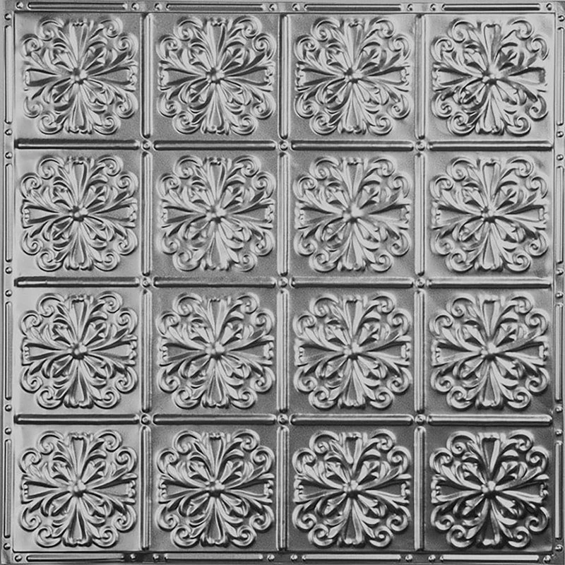 Set of 5 panels. pattern #27 features a charming floral design with a Parisian Art Deco influence. This (2 ft. x 2 ft.) authentic tin tile has a 6 inch minimally-embossed repeat, which makes it an excellent choice for a beautiful yet subtle renovation. Easy installation for a DIY project.