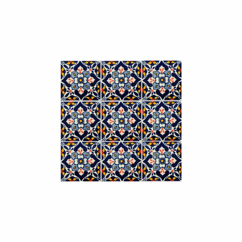 This is a nice pattern tile. Mostly yellow, terracotta and black. It contains a flowery center. It will be a nice addition to any wall or a liner accent. The second picture shows a pattern when more than one tile are put together.