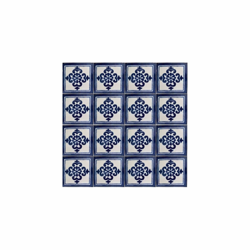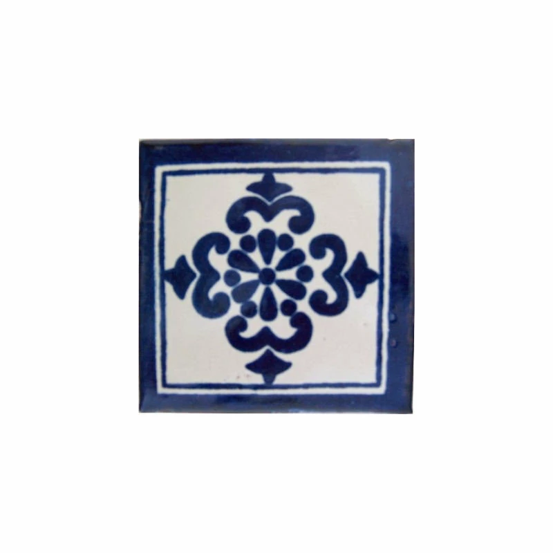 This deco-style Talavera ceramic tile features a blue 6-petals flower at its center surrounded by four crown-like decorations, all of them framed in a dark blue square. The background is white.Mexican Talavera ceramic is the result of a mixture of cultures over the time. The Spaniards were influenced by Arabic pottery, they brought it to Mexico and the mixture of cultures gave as result these beautiful art in ceramic. This ceramic tile is just an example of the exquisite beauty the Mexican craftsmen put on each item they create. It is handpainted, this means that no two tiles are exactly alike! There might be small differences in size, weight and even the paintings. If you want to delight somebody special with an unique handcrafted gift, this is what you are looking for! This tile is special for small patches or entire wall decoration.