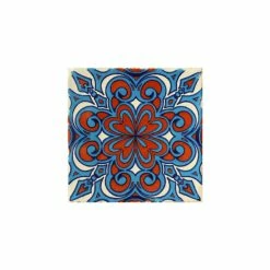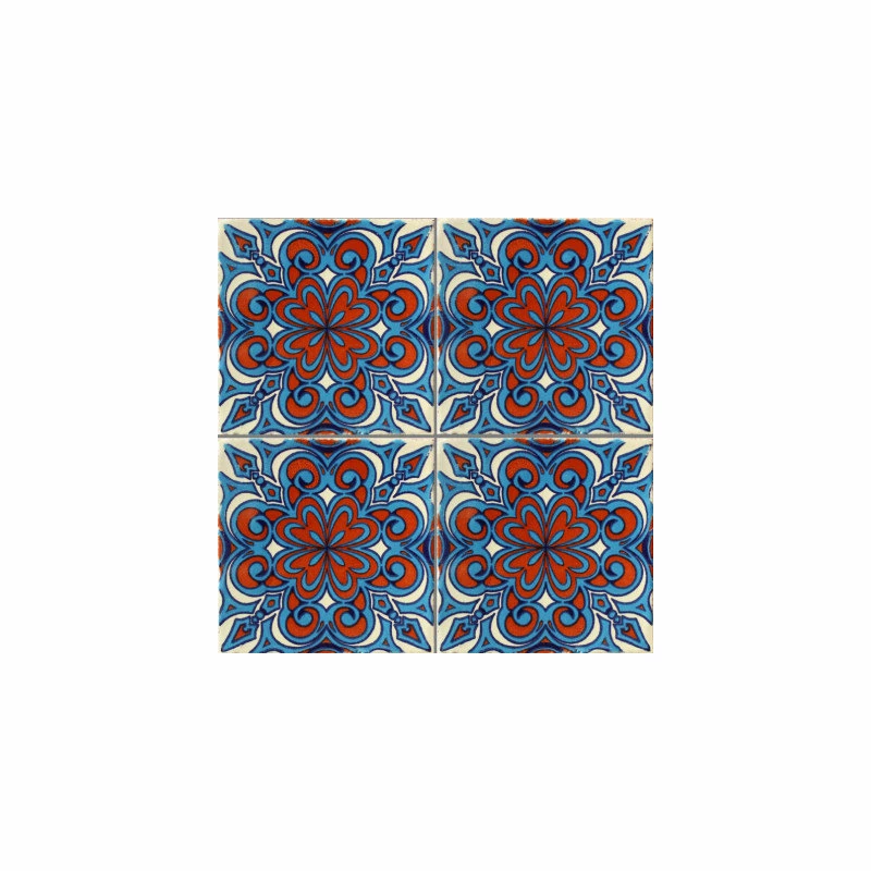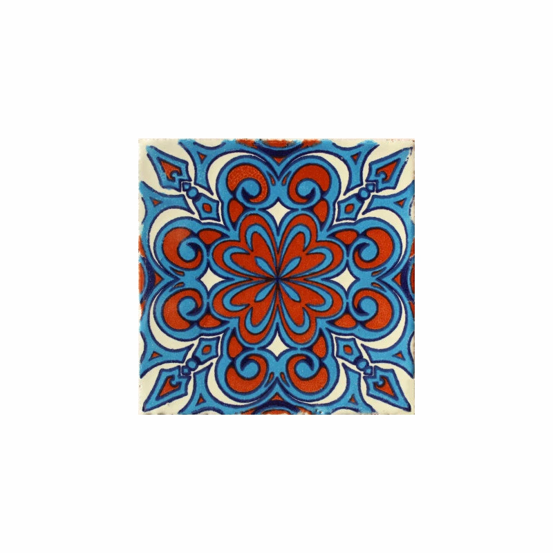 This tile creates a nice turquoise flower at the tile center. It goes nicely along Saltillo floor pavers and its earthy colors combine with a wide range of other home decor accessories. If your project includes decorative colorful Mexican tile, you might want to consider this one as a good candidate. Suitable for whole area installations or just as an accent over a field tile.