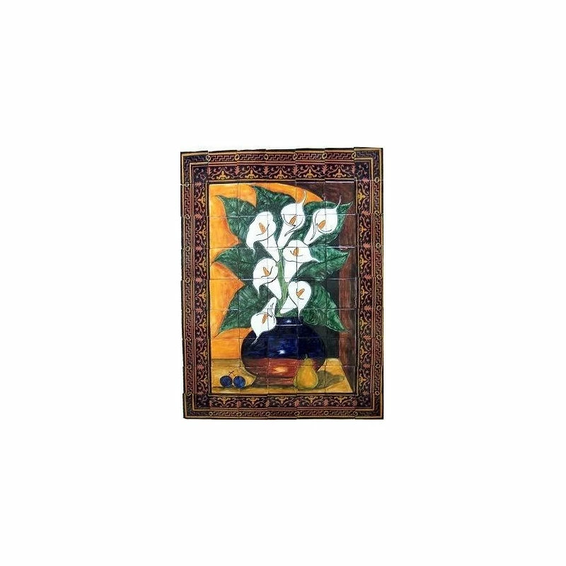 Alcatraz” in Spanish means callalillies. These beatiful flowers have being for generations inspiration for Mexican artists and artisans. A lot of our designs in ceramic and tile include this theme.The frame tiles are Black Mayan Clay Talavera Tile. Important Note: You will get the individual tiles in a box, the mural is not mounted to a board. If you want a board, lets us know, we can mount it for you for an extra fee. This Talavera tile mural will be a unique addition to your walls or any outdoors spot, fountain, or landscape with a Soutwestern and/or Mexican/Spanish style.This Talavera tile mural is composed of 63 pieces: 35 the main picture, 24 side frame tiles, and 4 corner tiles. This tile is handmade and fired to high temperatures to get a very solid and consistent piece of clay. This clay tile is just an example of the exquisite beauty the Mexican craftsmen put on each item they create. It is handpainted, this means that no two tile murals are exactly alike! There might be small differences in size, weight and even the decorations.”