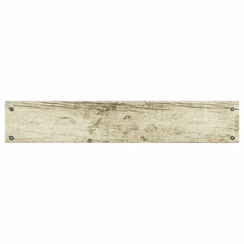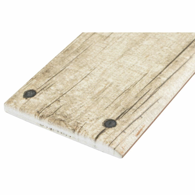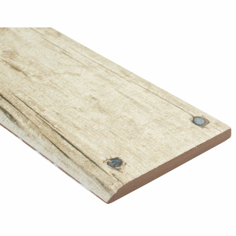 Our Cottage Beige Bullnose 3-1/8″ x 17-5/8″ Ceramic Wall Trim Tile is a finishing edge piece meant to coordinate with our wood-look Cottage Collection. Crafted in Spain, the unique tawny glaze features a meticulously detailed grain accented in tans and browns. The finishing touch on this beautiful tile is the realistic metallic nails that catch the light. This slightly textured, satin trim piece is great for adding a rustic touch to your interior walls. Tile is the better choice for your space. This tile is made from natural ingredients, making it a healthy choice as it is free from allergens, VOCs, formaldehyde and PVC.