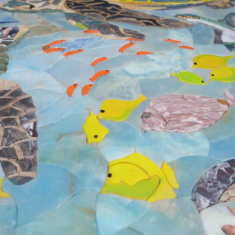 The Underwater ocean life is a stone art mosaic with the magnificent ocean creatures in the bottom of the sea. A handmade mosaic made from marble stones designed for both indoor and outdoor spaces.