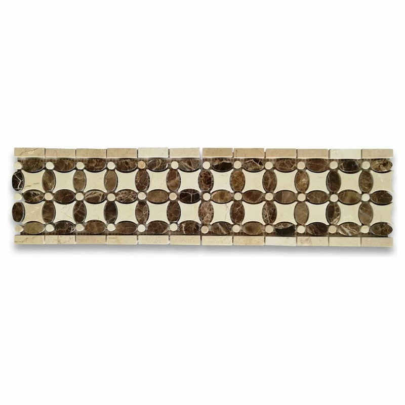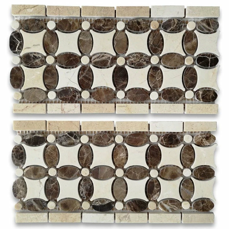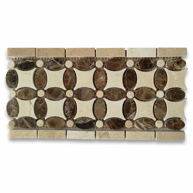 Emperador Dark Tulip Flower Waterjet Mosaic Border Listello Tile w/ Crema Marfil Beige Polished